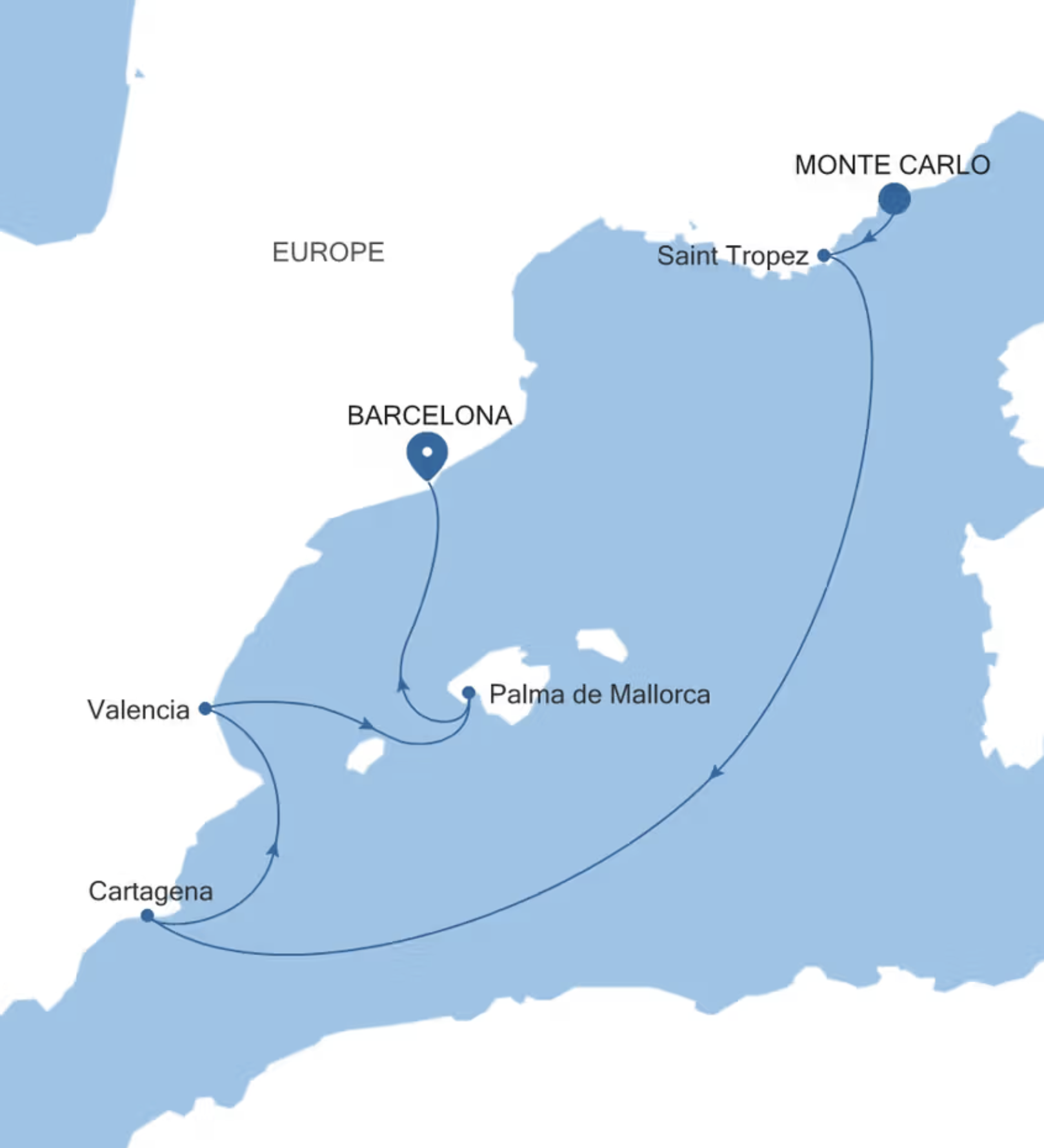 From the chic harbour of Saint-Tropez to the Roman theatre and naval heritage of Cartagena, the vibrant city of Valencia and the magnificent Gothic cathedral of Palma de Mallorca, this voyage offers a wonderful mix of culture, history and coastal beauty before concluding in the magnificent city of Barcelona.