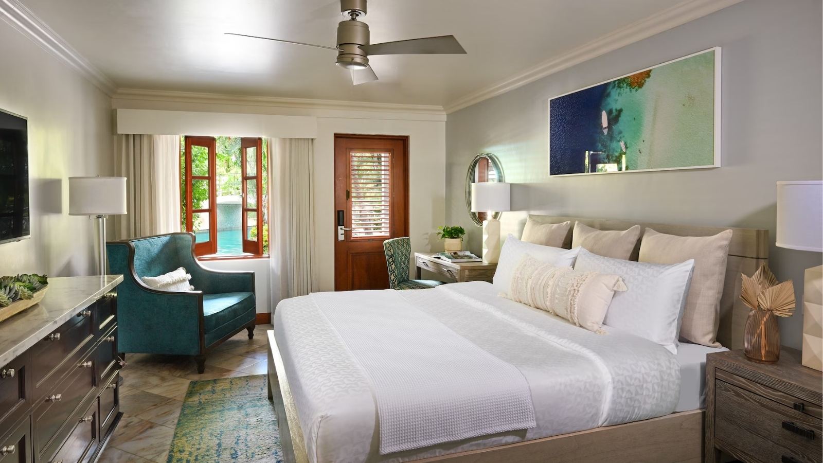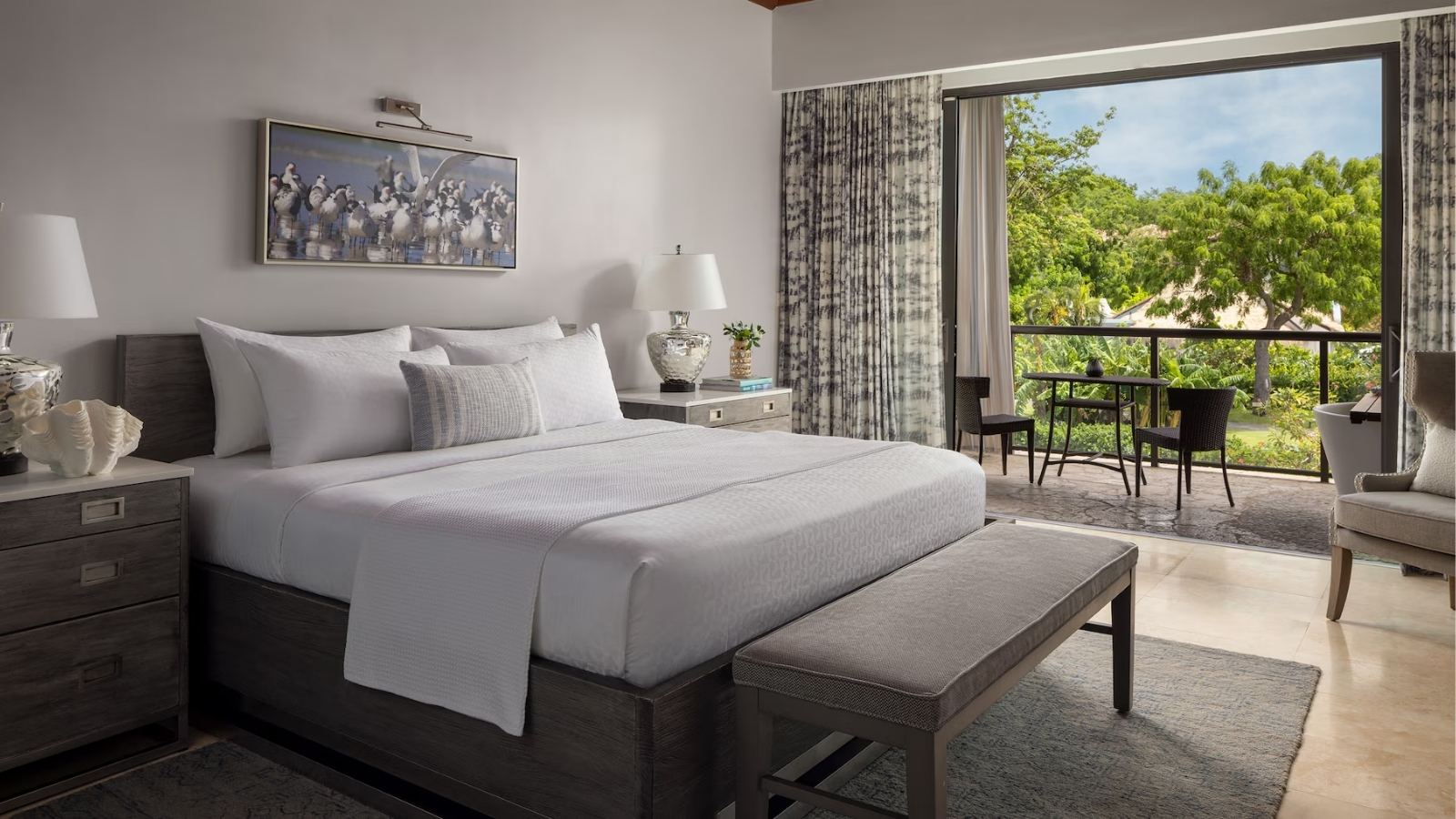 Set within the resort’s lush Lover’s Hideaway Village, these suites overlook a freshwater lagoon and feature a private balcony with an outdoor Tranquility Soaking Tub for two. Inside, find a four-poster king bed, smart TV, and contemporary bathroom with oversized shower. The stocked fridge includes Robert Mondavi wines, bottled water, soft drinks, and local beers, refreshed daily.